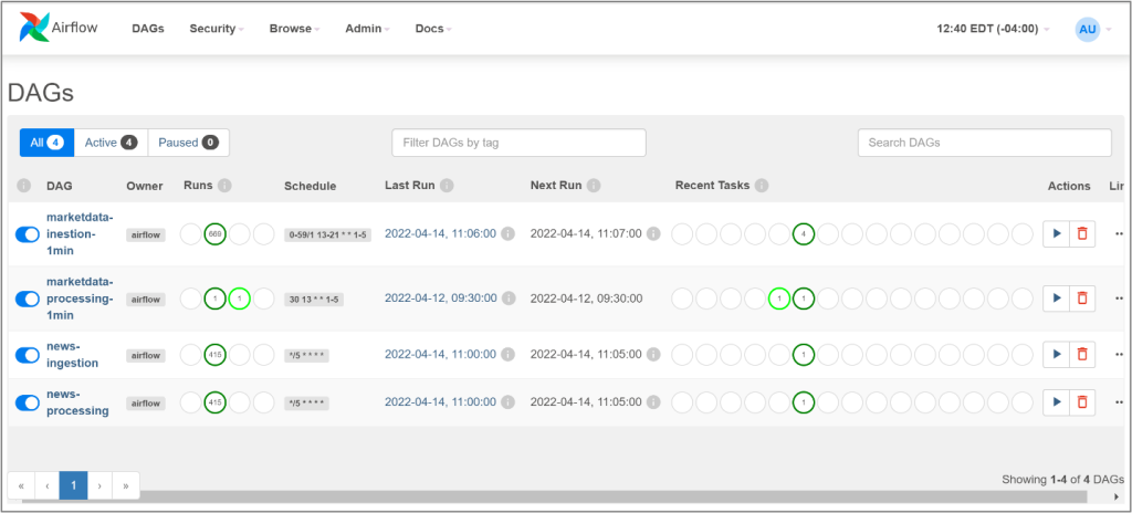After successfully logging in to the Airflow web application, you will see a page like the one below showing the four data pipelines included with this Sample Solution.