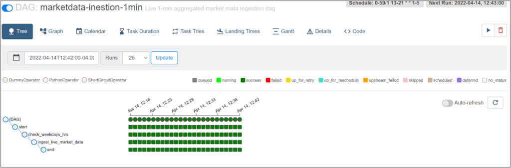 You can see the status of each DAG, its DAG runs, and its tasks in the main page. You can access more features if you click on each DAG and navigate to additional pages like the one below, which shows a tree view of your DAG runs and their tasks.