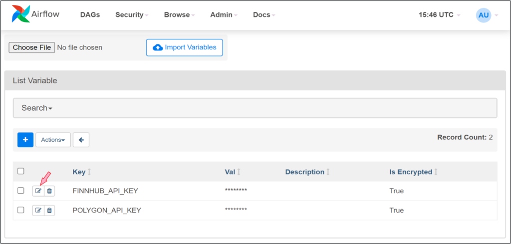API keys entered during deployment of the BoosterPack are saved as Airflow variables. These variables can be managed by navigating to the Admin > Variables page in the Airflow UI.