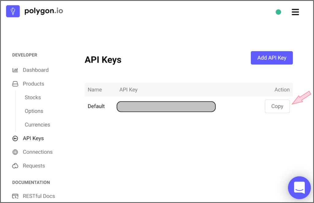 For polygon.io, after logging in to the site, you need to navigate to the API Keys page and click Add API Key. You can then copy the free API key, as shown below: