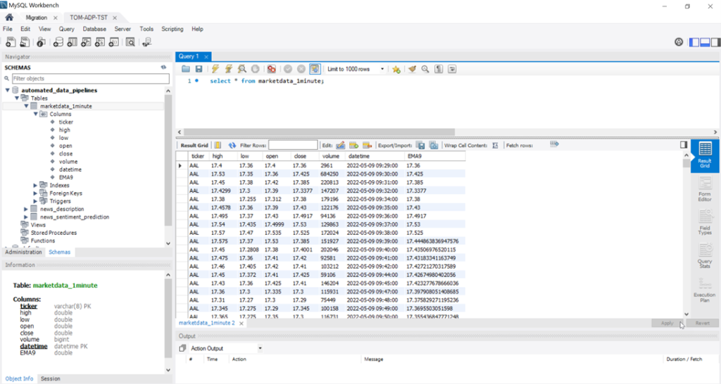 In the first pipeline, EMA9 [Exponential Moving Average of 9 days] technical indicator is calculated and saved in the MySQL database to demonstrate a typical processing procedure. In the second pipeline, news information is sent to news sentiment prediction API and the resulting sentiment information is saved in the MySQL database.