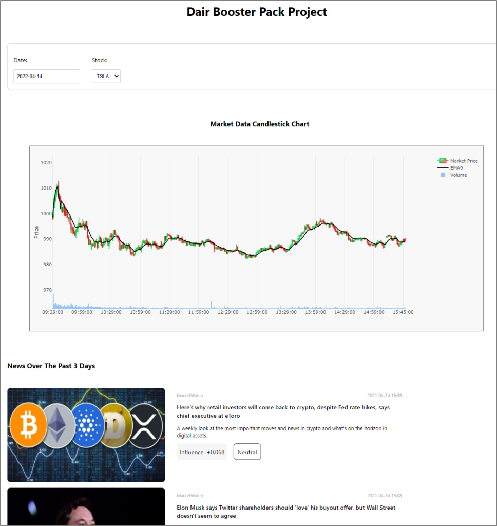 Finally, as the end point of the system, the solution’s outputs, including tickers’ candlestick prices, and related news are presented in a simple web UI. The webpage can be accessed from this URL: