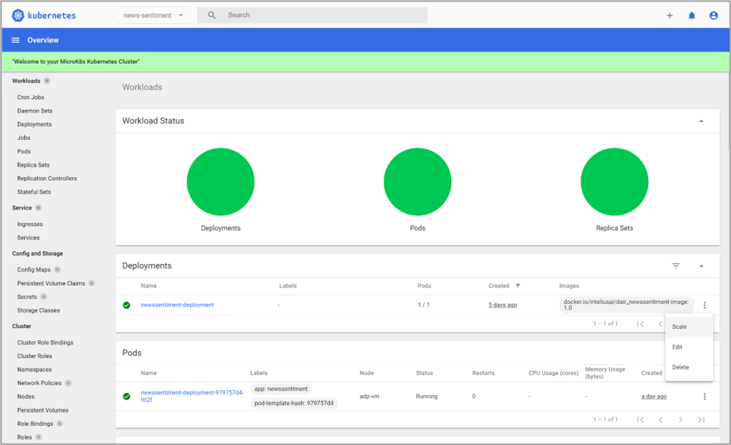 Scaling in the ADP solution can be managed at different levels and components of the solution. For example, as noted in this documentation, you may consider using a multi-node Kubernetes cluster to provide more resources for the system and support scaling up. Kubernetes has several options for manual or automatic scale up or down. For example, you may scale up analytics and middle-tier services by increasing their number of pods. While this can be done in multiple ways, the following image shows how the news sentiment prediction can be configured manually using the Kubernetes dashboard.