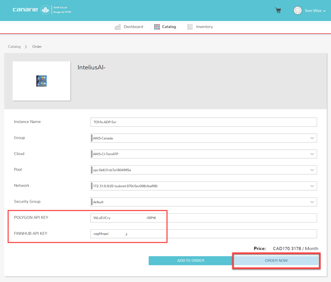 Click Next to go to CloudFormation step 2 and fill out the parameter configuration form. Ensure that you enter the API keys copied from Finnhub.io and polygon.io free subscriptions in the “APIKeyFINNHUB” and “APIKeyPOLYGON” fields respectively. In the “InstanceName” field, type in a unique instance name for your application server and then complete the rest of the form using the drop-down options. Please note that other parameters (such as “ApplicationImage” and “InstanceType”) are pre-configured and cannot be modified.