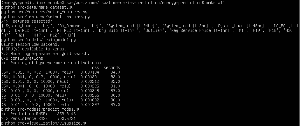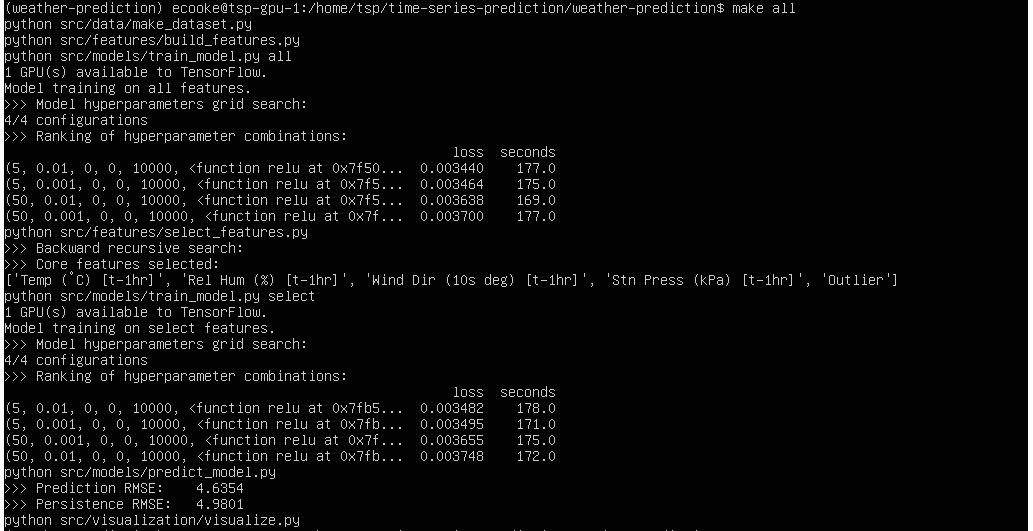 The first command takes you to the appropriate directory. The second command activates the appropriate Miniconda Python environment. The third command make all runs the Python scripts that prepare the data, train the model, and make predictions. (Here, ‘make’ refers to the software build automation tool.)