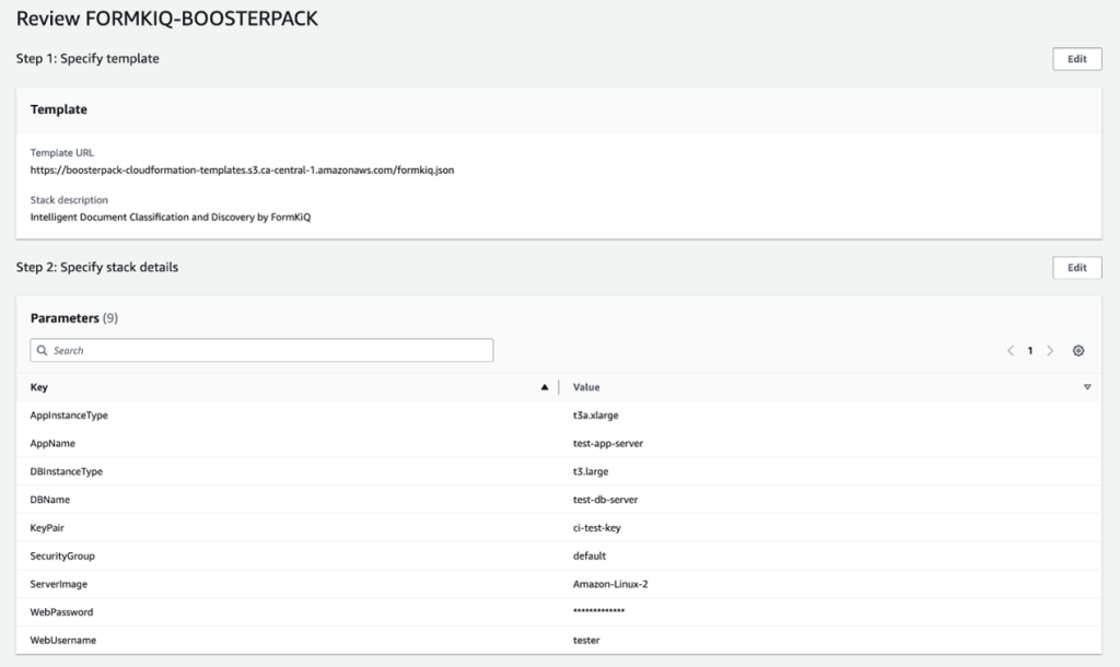 The final section allows you to review existing BoosterPack configurations and provides options for making configuration changes, using the “Edit” button, if needed. Once satisfied with the existing configuration, click “Submit” at the bottom of the page to deploy the BoosterPack.