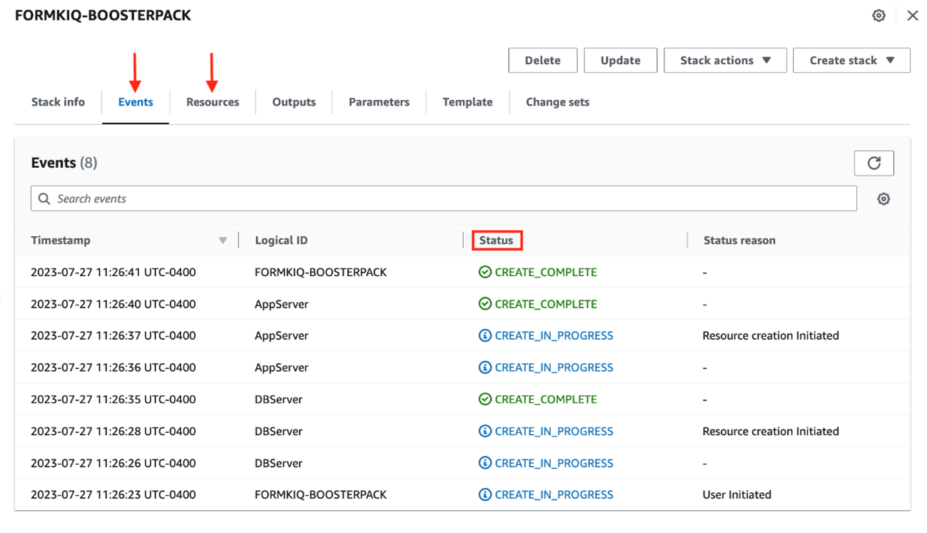 The BoosterPack deployment will start by creating 2 new instances (including the web application server and database server) and the deployment automation will follow. However, you can only monitor the status of the AWS instances through the “Events” and “Resources” tab of the CloudFormation page and you will need to subsequently log in to the web application and database servers to confirm each deployment automation status.