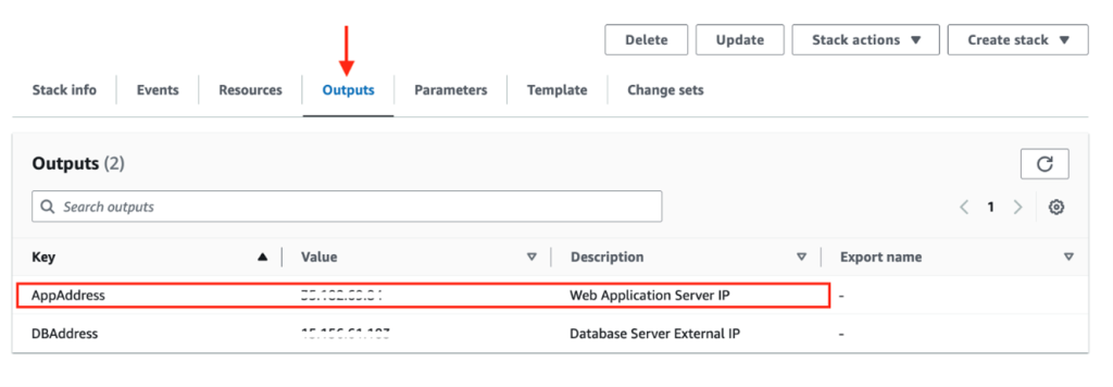 Make a note of the “Web Application Server IP” value found under the “Outputs” tab of the BoosterPack CloudFormation page. This is the external/public IP of the web application server of the BoosterPackbeing created. You will need this IP address to access the web interfaces of the sample application or to login to the server using SSH.