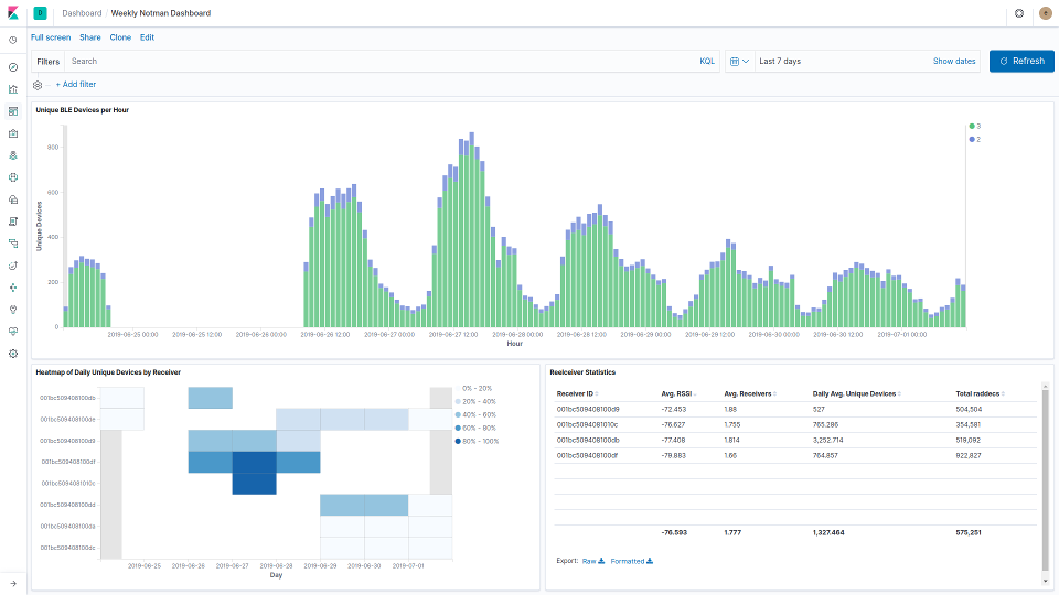Kibana is an open source software that lets you visualize Elasticsearch data. Elasticsearch is an open source database in which real-time location data is stored. For our purposes, Kibana provides a user-friendly means to visualize trends in occupancy and the real-time location of people and assets over time.