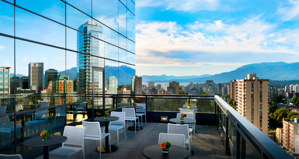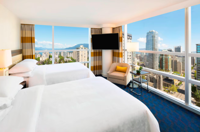 The Sheraton Vancouver Wall Centre is centrally located in downtown Vancouver and a short distance from attractions such as Stanley Park, English Bay, the Seawall, Yaletown, and Robson Street. The hotel offers both city and ocean views and the comforts of home in a chic, urban setting. Guests are welcome to work out in the on-site fitness centre or take a dip in the heated pool.