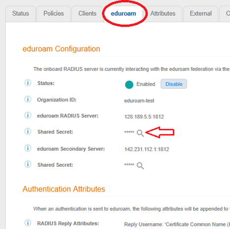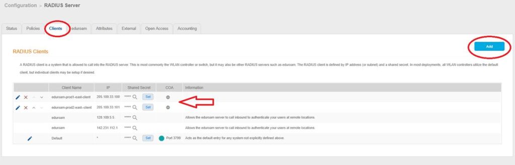 - Sous l’onglet « eduroam », déterminez l’adresse IP des deux serveurs fédérés qui ont déjà été configurés. Remarque : nous vous recommandons de configurer l’adresse IP la plus près en premier et en deuxième, celle du serveur dans la région opposée (est/ouest du Canada).