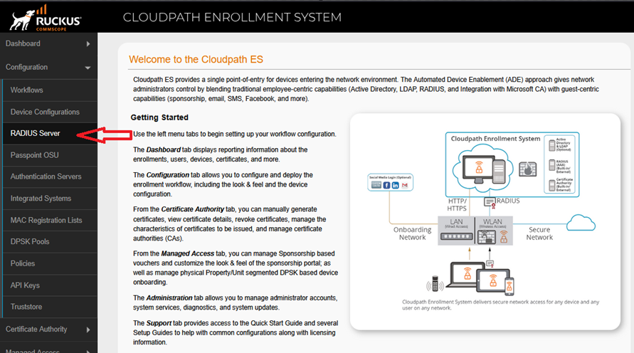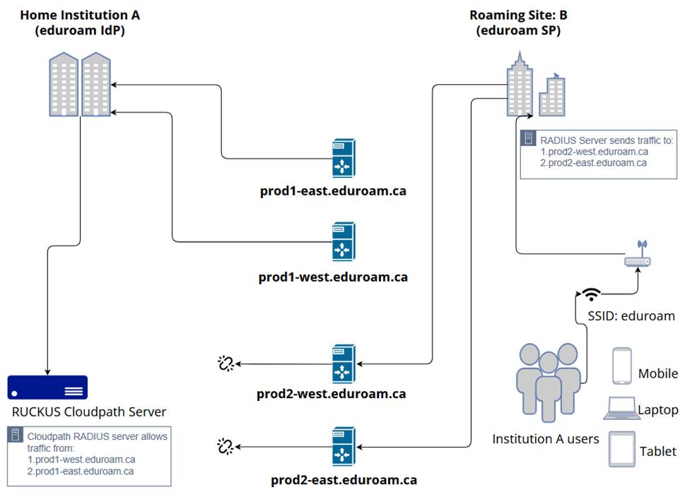 CANARIE a conçu le service eduroam canadien pour qu’il soit résilient en fédérant quatre serveurs RADIUS (deux dans l’Ouest et deux dans l’Est). Ce document explique comment configurer la plateforme Cloudpath de Ruckus sur le serveur RADIUS du fournisseur d’identités d’eduroam (FI) pour qu’il accepte le trafic venant des quatre serveurs fédérés. Référence : https://www.canarie.ca/document/caf-firewall-and-ip-address-recommendations-for-eduroam/