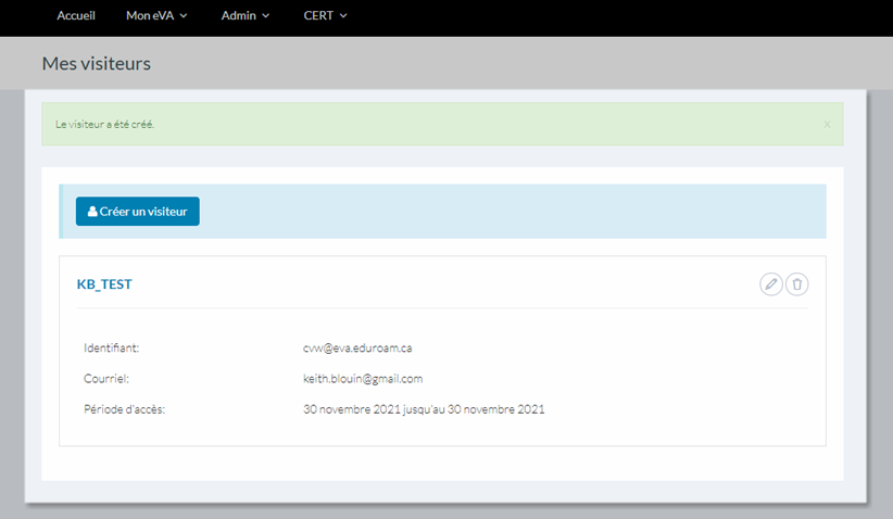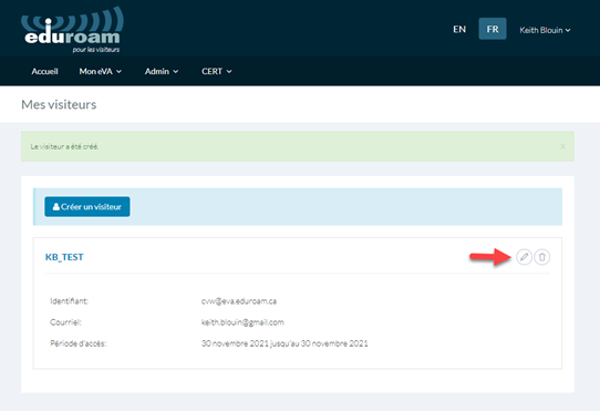 - Période d’accès (début et fin de la période durant laquelle le visiteur aura accès à eduroam)