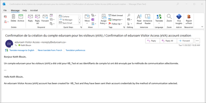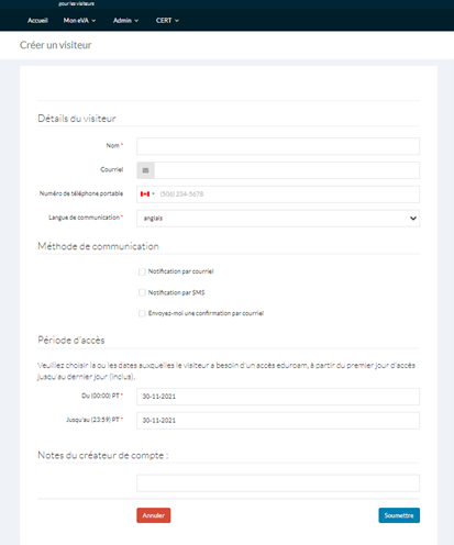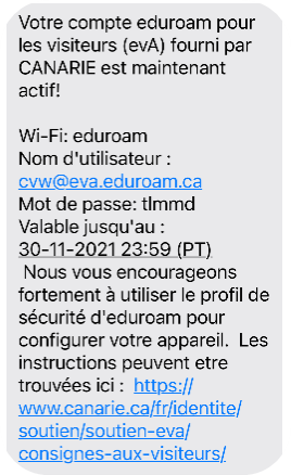 Les visiteurs recevront un avis leur signalant qu’un compte eVA a été créé à leur nom. L’avis sera transmis par courriel, par SMS ou les deux (selon l’option choisie).