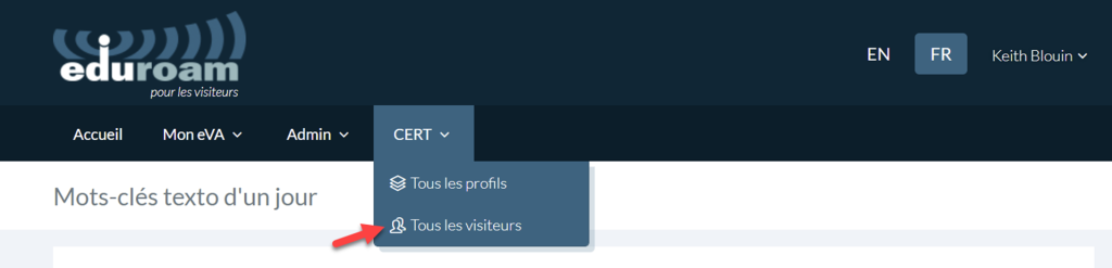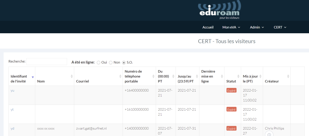 L’administrateur eVA de l’organisation peut voir le compte de tous les visiteurs de son organisation. Cependant, seuls les membres CERT ou les utilisateurs qui ont créé le compte pourront le modifier et le supprimer.