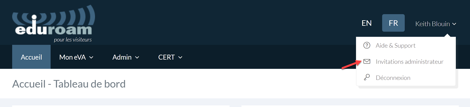 - Avec le curseur, survolez votre nom dans le coin supérieur droit du portal et sélectionnez « Invitations administrateur ».