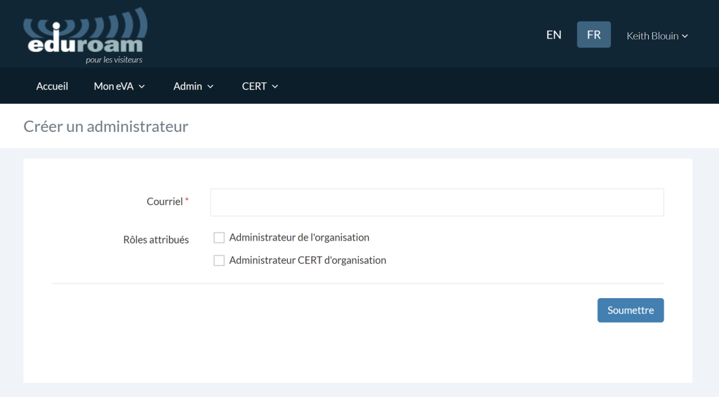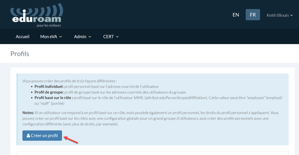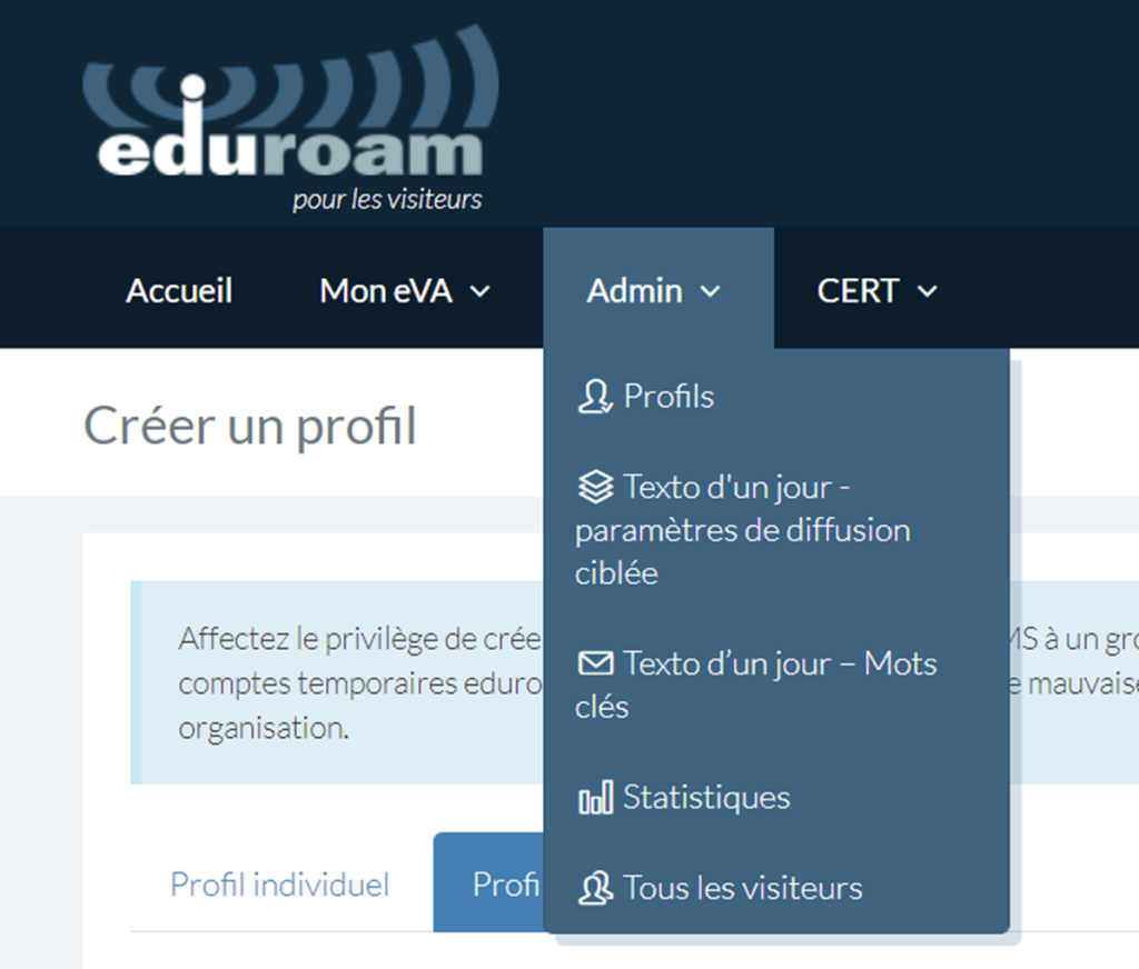 En tant qu’administrateur eVA de l’organisation, vous pouvez créer et gérer le profil eVA et les autorisations qui seront attribués aux utilisateurs sous votre responsabilité. Vous avez aussi accès aux autres fonctionnalités du service eVA[1]. L’administrateur eVA crée et gère le profil des utilisateurs, alors que les membres de l’équipe CERT (équipe d’intervention d’urgence en informatique) peuvent voir, modifier et supprimer tous les comptes eduroam temporaires de l’organisation.