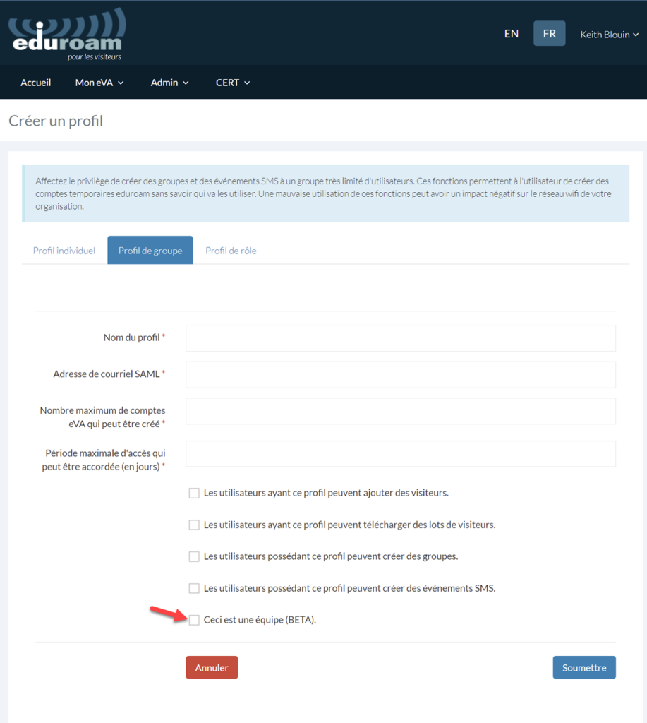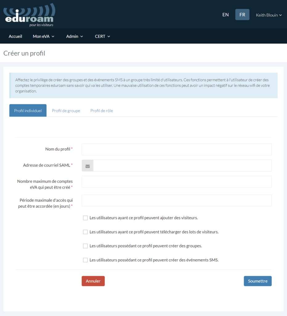 N’accordez les droits L’utilisateur possédant ce profil peut créer des groupes et L’utilisateur possédant ce profil peut créer des événements SMS qu’à très peu d’utilisateurs, car ces fonctions permettent la création d’un compte eduroam temporaire sans qu’on sache exactement qui s’en servira. L’usage inapproprié de ces fonctions pourrait avoir une incidence négative sur les réseaux de l’organisation et ceux des autres fournisseurs du service eduroam.