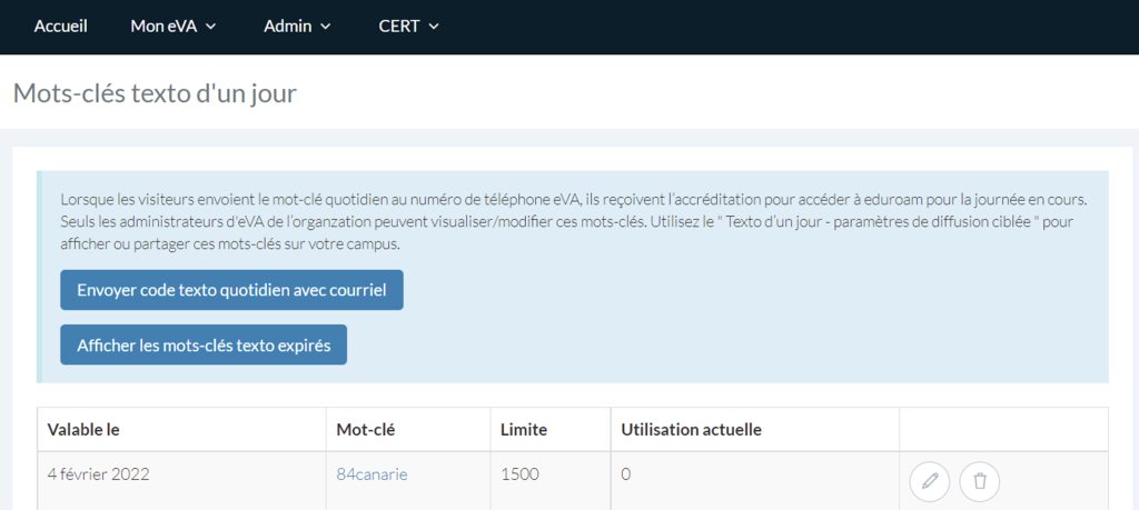 Pour voir ou modifier un mot-clé, cliquez Admin > Texto d’un jour – Mots clés.