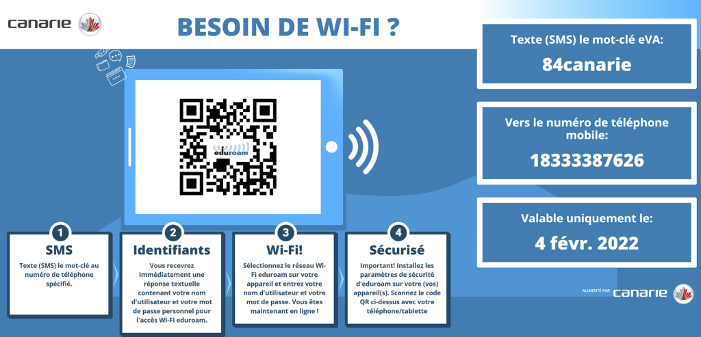 Grâce à cette fonctionnalité, l’organisation peut laisser le visiteur ouvrir lui-même un compte temporaire d’un jour au service eduroam au moyen du mot-clé qui lui est envoyé par texto.