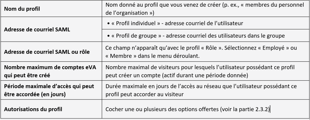 Pour qu’un membre de l’organisation puisse agir en tant qu’hôte et créer des comptes temporaires à l’intention des visiteurs, il faut d’abord créer un profil qui établira les autorisations accordées au membre en question. Créer un tel profil est un jeu d’enfant pour l’administrateur eVA de l’organisation, mais il est important de bien réfléchir à la façon dont le profil sera configuré et aux permissions qui y seront rattachées pour éviter que des visiteurs non autorisés accèdent sciemment ou accidentellement au réseau.