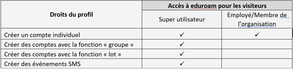 - L’utilisateur possédant ce profil peut créer des événements SMS (créer des événements temporaires permettant au visiteur d’accéder au réseau sans fil eduroam grâce à un mot de passe envoyé par texto).