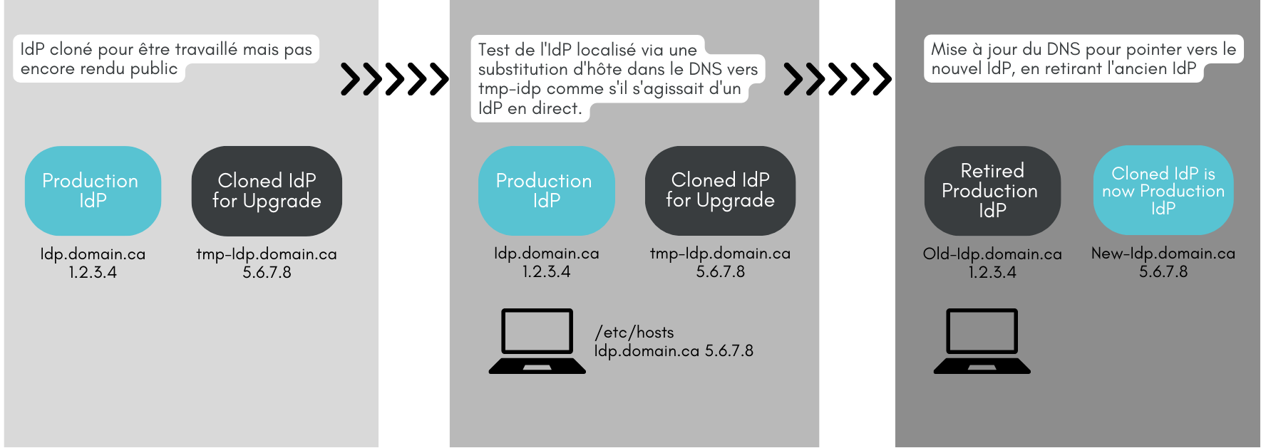 Vous devrez avoir mis à niveau l’IdP de Shibboleth sur la machine existante ou, de préférence, sur un clone ou un banc d’essai qui la reproduit pour que les modifications s’effectuent à l’écart des opérations jusqu’au moment où on décidera de procéder à la permutation. De cette façon, l’administrateur de l’IdP pourra attribuer le nom DNS au nouvel environnement à sa discrétion.