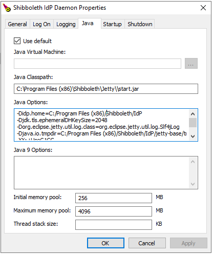 To see what settings you already have:c:\Program Files (x86)\Shibboleth\ProcRun\amd64\shibd_idp.exe //PS