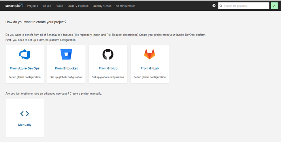 4. Lorsque vous aurez actualisé le mod de passe, vous verrez s’afficher une page énumérant les possibilités d’intégration pour la plateforme DevOps ou vous permettant de configurer le projet manuellement.