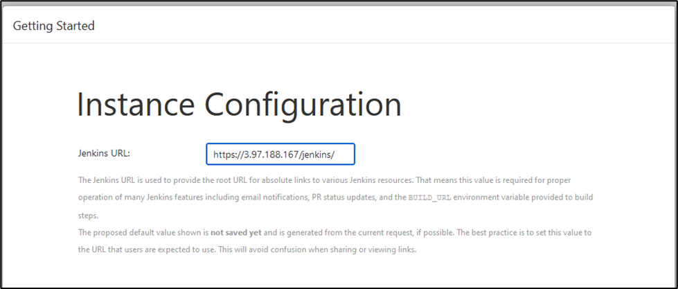 Nous préconisons d’utiliser la valeur par défaut pour configurer l’instance. Assurez-vous que l’URL de Jenkins comprend l’adresse IP externe précise de la MV.