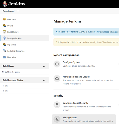 1. Cliquez Manage Jenkins dans le panneau de gauche, puis Manage Users sous la rubrique Security.