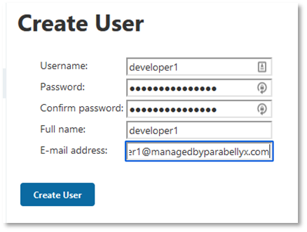 6. Cliquez Create User dans le coin supérieur droit. Pour la solution type, nous baptiserons cet utilisateur « developer1 ».