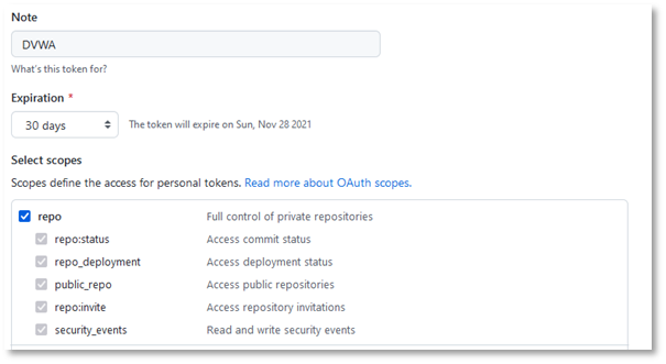 2. Dans Select scopes, cliquez la case à côté de repo, et parcourez la liste jusqu’en bas puis cliquez Generate token.