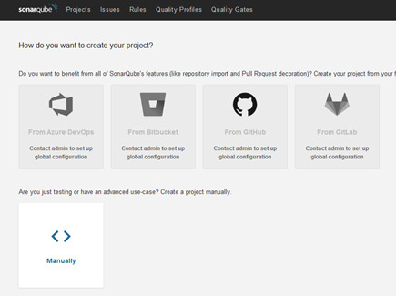 1. Ouvrez une séance dans SonarQube avec le compte developer1 et sélectionnez Manually pour créer un nouveau projet.