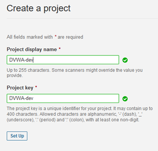 2. Saisissez un nom évocateur pour Project display name et Project key. Pour notre exemple, nous utiliserons DVWA-dev. Cliquez Set Up pour continuer.