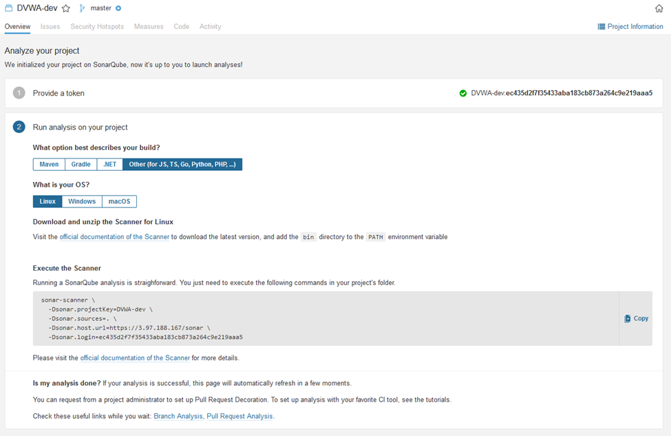 Remarque : n’utilisez PAS la commande sonar-scanner qui apparaît dans l’encadré, car l’adresse IP de votre sonar.host.url et les valeurs de sonar.login ne seront pas les mêmes.