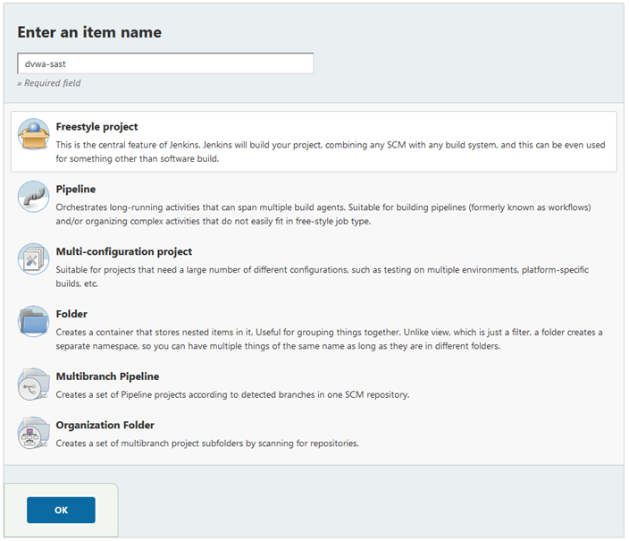 2. Dans le menu principal, cliquez Create a job pour voir la page énumérant les projets. Saisissez dvwa-sast comme Item name et sélectionnez Freestyle project, puis cliquez OK.