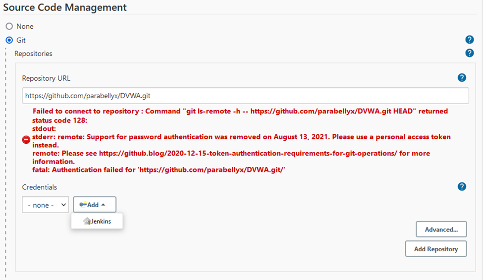 4. Si vous utilisez un dépôt privé, Jenkins ne pourra accéder au code source sans jeton. Configurez l’accès en cliquant Add directement sous Credentials puis en sélectionnant Jenkins.