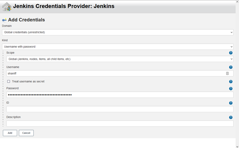 5. Sur l’écran Credentials Provider de Jenkins, sous Kind, sélectionnez Username with password dans le menu déroulant. 6. Saisissez votre identifiant GitHub et le jeton que vous avez créé plus tôt comme mot de passe. Ensuite, cliquez Add.