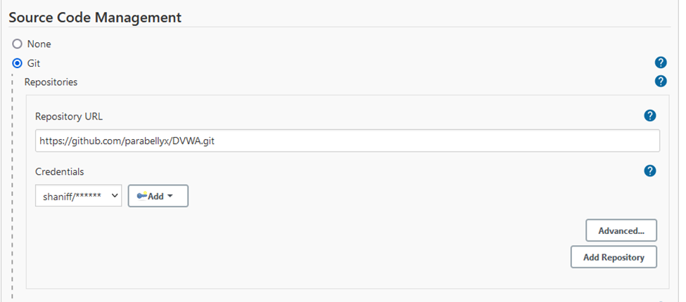 3. Dans Source Code Management, sélectionnez Git et saisissez l’URL du dépôt.