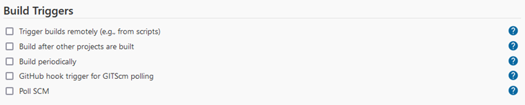8. Les Build Triggers facilitent l’automatisation du pipeline au démarrage. Pour la solution type cependant, nous lancerons le pipeline manuellement. Donc, ne cochez aucune case.