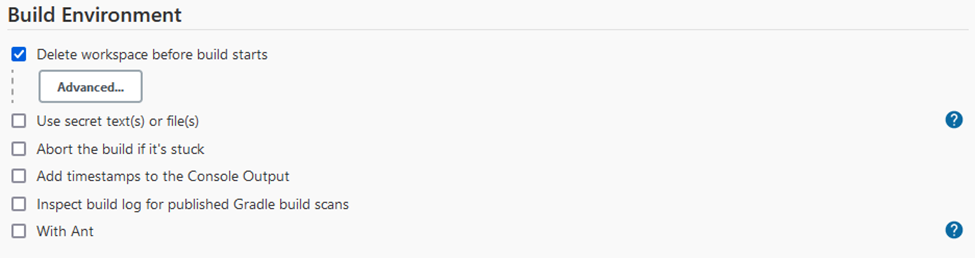 9. Pour Build Environment, mieux vaut cocher Delete workspace before build starts afin d’éliminer tous les éléments qui pourraient subsister des réalisations antérieures. Ne cochez aucune autre option.