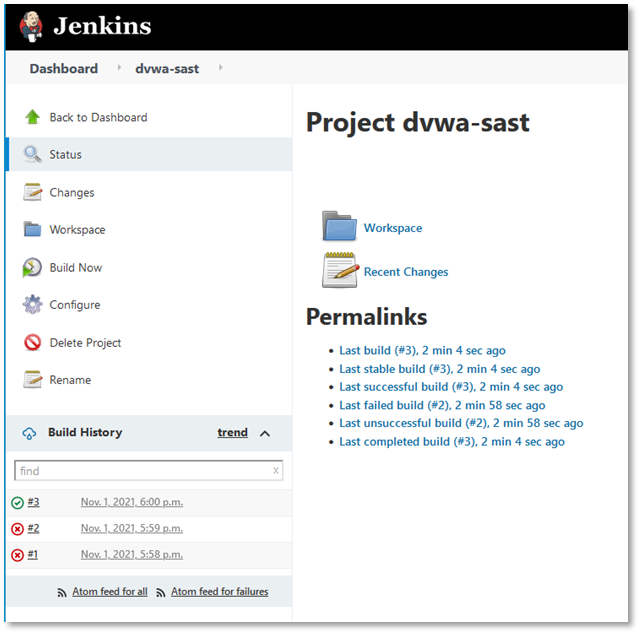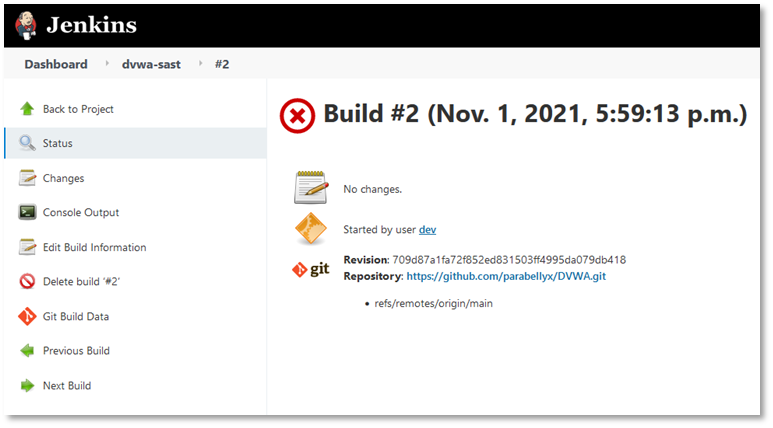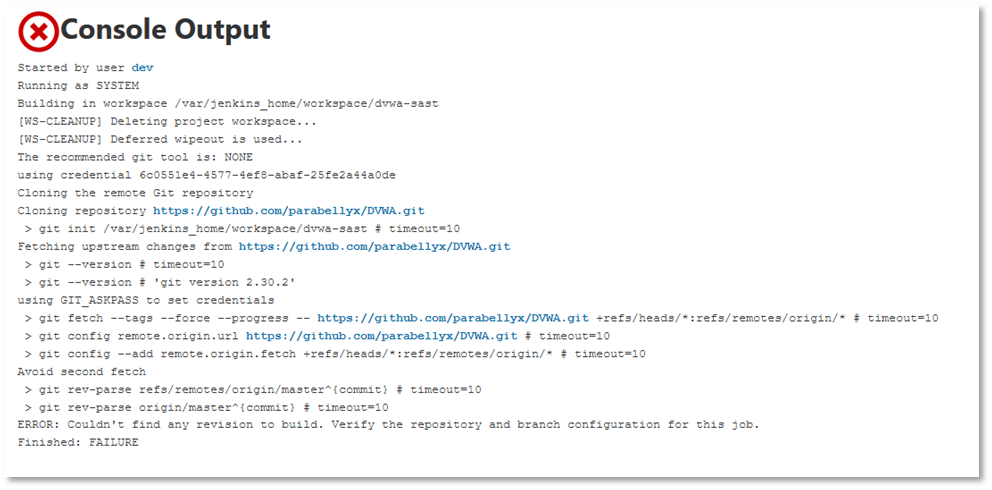 L’état de la version apparaîtra dans ‘Build History.’ Au début, nous avions commis une erreur de configuration dans Git qui renvoyait à un embranchement inexistant. Pour en savoir plus sur ce problème, qui a entraîné l’échec de l’application, cliquez la version numérotée à côté du x rouge.