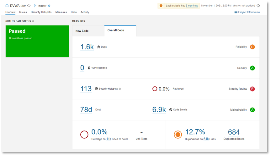 La solution type illustre l’application des essais statiques à un projet situé dans le dépôt de codes sources de l’organisation. Aux fins d’illustration, nous utiliserons l’application Damn Vulnerable Web Application (DVWA), une application défectueuse incluant de nombreuses vulnérabilités. Son code se trouve dans un dépôt public Github que vous devriez cloner dans votre propre dépôt Git avec la commande suivante :