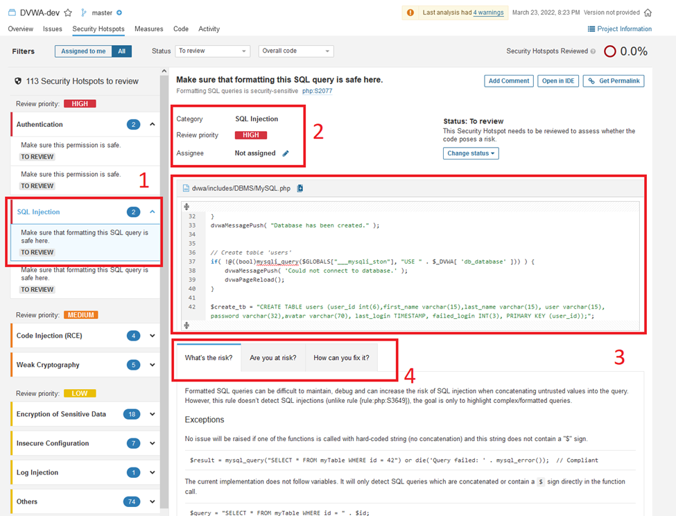 4. Cliquez l’onglet Security Hotspots pour savoir comment corriger l’application.