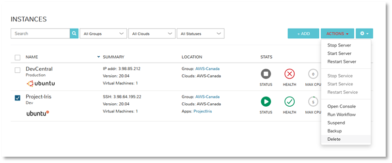 Sur l’écran Provisioning > Instances, cochez la boîte à côté de Project-Argus VM et sélectionnez Delete dans le menu déroulant ACTIONS.