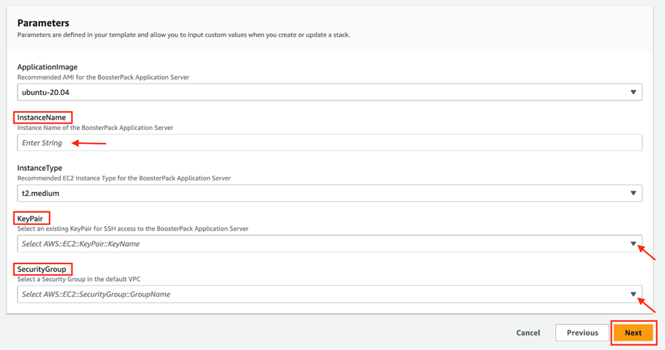 Cliquez Suivant pour passer à la deuxième étape de Cloudformation et remplissez le formulaire de configuration. Dans le champ InstanceName, donnez un nom unique à l’instance de votre serveur d’application, puis complétez le formulaire avec les menus déroulants.