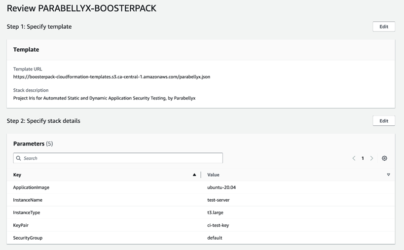 Ouvrez une autre fenêtre dans le navigateur et rendez-vous sur la page du Catalogue des Propulseurs de l’ATIR puis à la section de Parabelllyx (Analyse statique et dynamique automatisée de la sécurité des applications) et cliquez DÉPLOYER pour lancer le Propulseur avec la pile AWS Cloudformation.