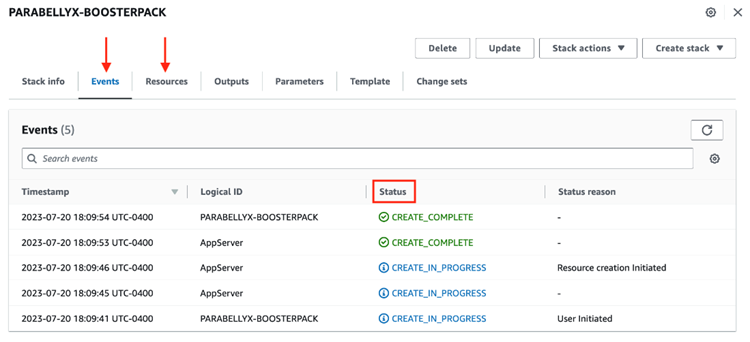Le déploiement commence par la création d’une nouvelle instance. Le reste est automatique. Suivre le développement de l’instance AWS n’est possible qu’avec les onglets Événements et Ressources de la console CloudFormation. Pour vérifier l’avancement du déploiement, vous devrez donc vous connecter au serveur de l’application.