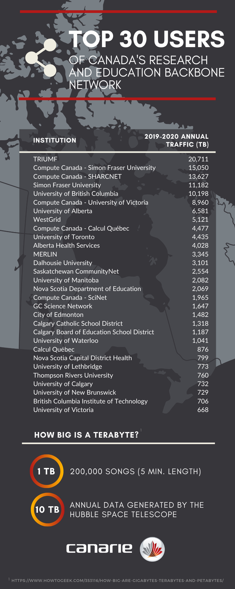 Sans le réseau CANARIE, le Canada ne serait pas le chef de file qu’on connaît dans les domaines de la recherche et de la découverte. Ce réseau, qui s’étire sur plus de 40 000 kilomètres au pays, entre Beaver Creek (Yn) et St. John’s (T.-N.-L.) et aussi loin dans le nord qu’Inuvik (Nt), est à la disposition des millions d’étudiants et de chercheurs des quelque 700 établissements d’enseignement et installations de recherche qui y sont connectés.
